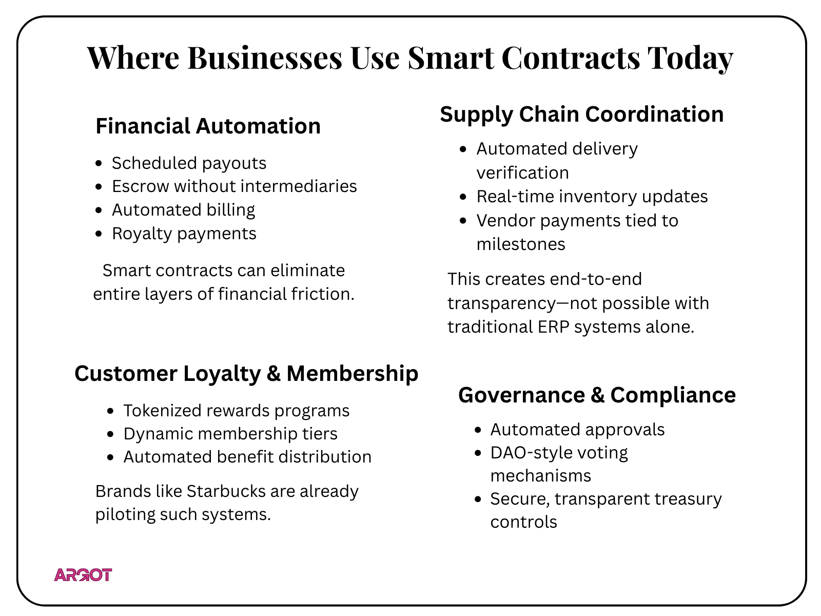 If your organization is evaluating how smart contracts could unlock automation, transparency, or cost efficiency, Argot provides structured assessments, pilot design, and implementation guidance to support responsible adoption.